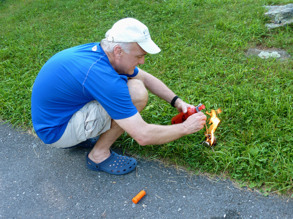 John has a mishap trying to light his stove. The grass caught fire, and we didn't use his stove the rest of the trip.